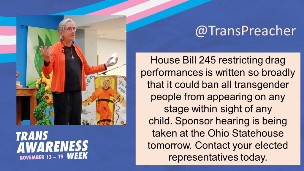 Today is the beginning of Transgender Awareness Week–a time for everyone to take action to support our right to exist. Tomorrow the Ohio House is hearing testimony intended to ban drag performers but impacting anyone who performs while wearing clothing or makeup different from their gender assigned at birth. Contact your representative today.