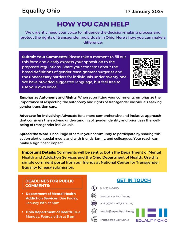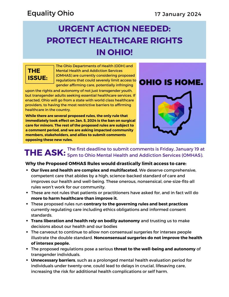 Ohio is on track to become the most restrictive state in the country in regards to transgender healthcare for youth and adults. Proposed regulations do not follow medical best practices, exacerbate existing barriers to healthcare access, and violate the bodily autonomy of adult Ohioans. Your voice can help change that. Click on the link below to add your voice to opposing rules that would make transgender healthcare difficult to receive: