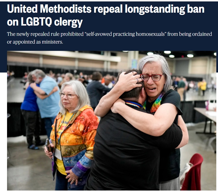 The changes are historic in a denomination that has debated LGBTQ issues for more than half a century at its General Conferences, which typically meet every four years. On Tuesday, delegates voted to remove mandatory penalties for conducting same-sex marriages and to remove their denomination’s bans on considering LGBTQ candidates for ministry and on funding for gay-friendly ministries.