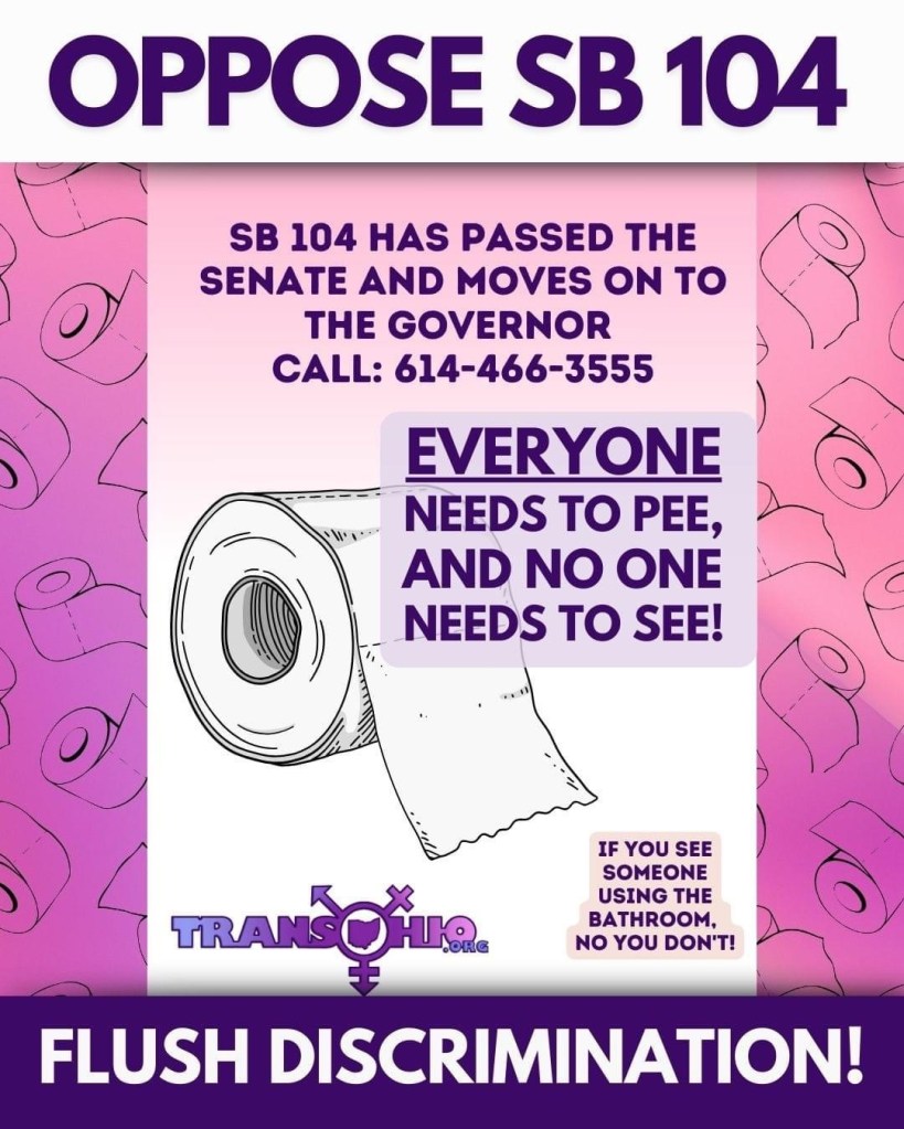 Ohio SB 104’s bathroom bill will result in trans youth being bullied and increased suicide ideation. Tell Gov DeWine to veto. Add your name to the petition at https://docs.google.com/forms/d/e/1FAIpQLSfUhyiWkqkbI3pXLIZGKZ5nXi5c3loNAvUb9dOX3_ko2-I-yw/viewform
