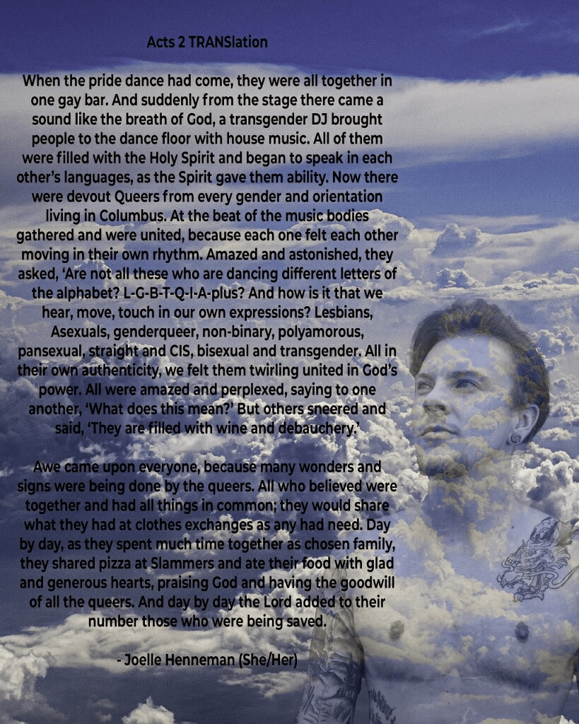 Journaling is one common way of reflecting on scripture. I have combined journaling with creative writing to reimagine how scripture can be placed in a modern context of time, place, and gender. The following page is a poster that photographer Vincent-Natasha Gay made of my TRANSlation of Acts, Chapter 2.